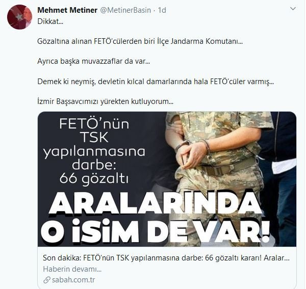 Metiner, "Demek ki neymiş, devletin kılcal damarlarında hala FETÖ’cüler varmış..." ifadelerini kullandı.
