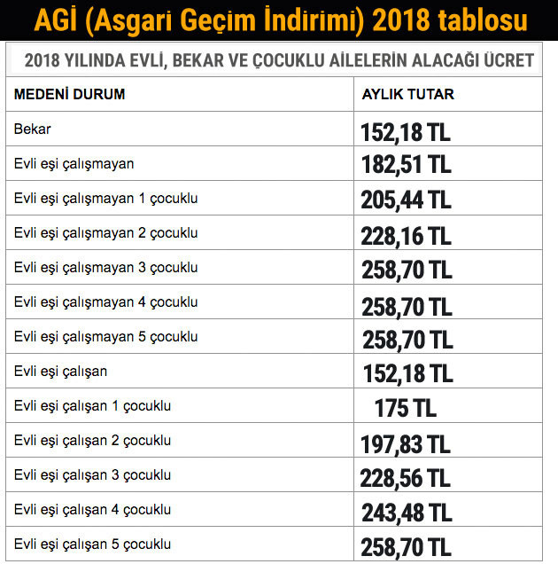İŞTE 2018 AGİ TABLOSU (Asgari Geçim İndirimi): Açıklanan yeni asgari ücretin ardından 2018 AGİ Tablosu da şu şekilde güncellendi: