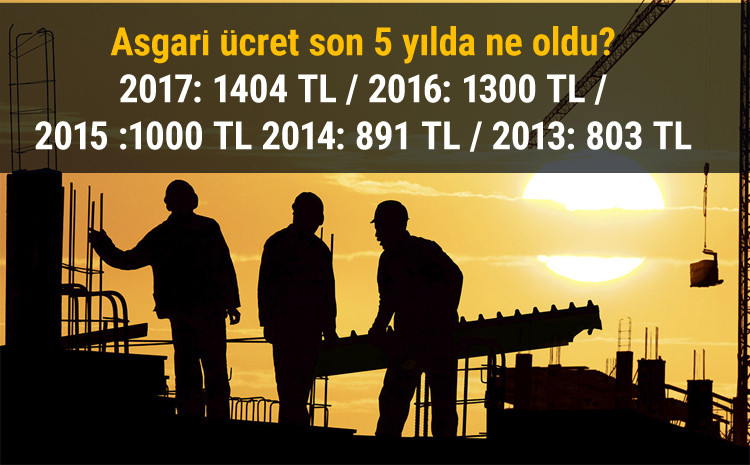 Asgari ücret ne kadar son 5 yılın rakamları : Yıllar bazında net asgari ücret rakamları şöyle: 2017: 1404 TL / 2016: 1300 TL / 2015: 1 Ocak'ta 949TL, 1 Temmuz-1000 TL / 2014: 1 Ocak-846 TL, 1 Temmuz-891 TL
