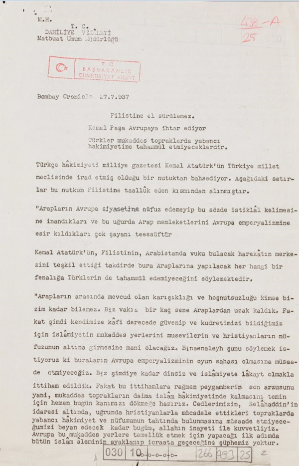 KANIMIZI DÖKMEYE HAZIRIZ: Atatürk’ün Avrupa’ya Filistin konusunda ültimatom verdiğini gösterir açıklamaları şöyle: Biz vakıa bir kaç sene Araplardan uzak kaldık. Fakat şimdi kendimize kâfi derecede güvenip ve kudretimizi bildiğimiz için İslamiyet’in mukaddes yerlerini Musevilerin ve Hristiyanların nüfuzunun altına girmesine mani olacağız. Biz şimdiye kadar dinsiz ve İslamiyet’e lakayt olmakla itham edildik.