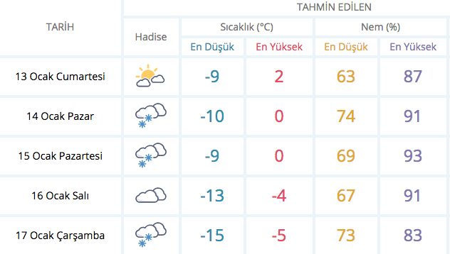 Erzurum için meteoroloji 5 günlük hava durumu tahmini yayınladı. Yarın yani 15 Ocak pazartesi günü kar devam ediyor. İşte Erzurum hava durumu;
