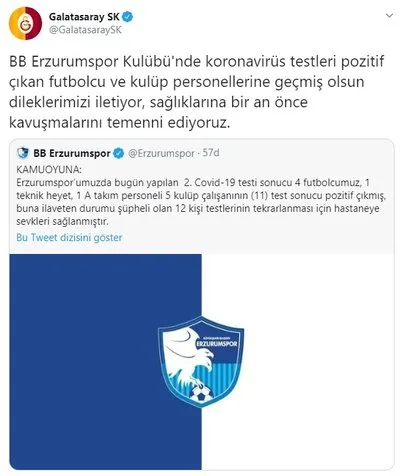 Galatasaray: "BB Erzurumspor Kulübü'nde koronavirüs testleri pozitif çıkan futbolcu ve kulüp personellerine geçmiş olsun dileklerimizi iletiyor, sağlıklarına bir an önce kavuşmalarını temenni ediyoruz."
