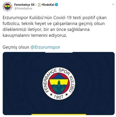 Fenerbahçe: "Erzurumspor Kulübü'nün Covid-19 testi pozitif çıkan futbolcu, teknik heyet ve çalışanlarına geçmiş olsun dileklerimizi iletiyor, bir an önce sağlıklarına kavuşmalarını temenni ediyoruz. Geçmiş olsun Erzurumspor"