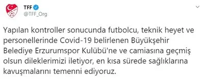 TFF: "Yapılan kontroller sonucunda futbolcu, teknik heyet ve personellerinde Covid-19 belirlenen Büyükşehir Belediye Erzurumspor Kulübü'ne ve camiasına geçmiş olsun dileklerimizi iletiyor, en kısa sürede sağlıklarına kavuşmalarını temenni ediyoruz."