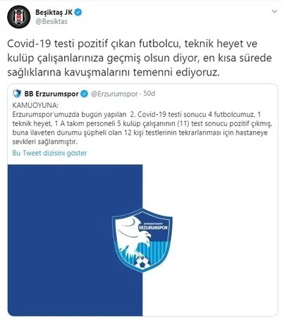 Beşiktaş: "Covid-19 testi pozitif çıkan futbolcu, teknik heyet ve kulüp çalışanlarınıza geçmiş olsun diyor, en kısa sürede sağlıklarına kavuşmalarını temenni ediyoruz."