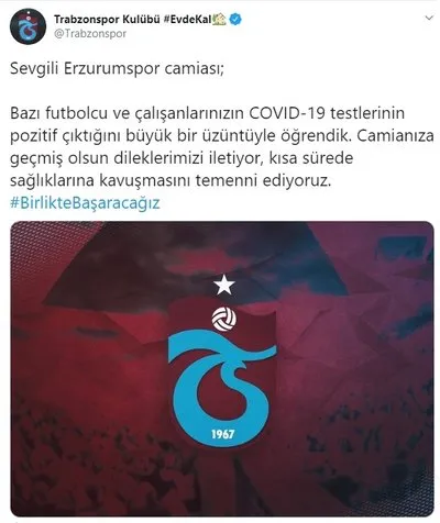 Trabzonspor: "Sevgili Erzurumspor camiası; Bazı futbolcu ve çalışanlarınızın COVID-19 testlerinin pozitif çıktığını büyük bir üzüntüyle öğrendik. Camianıza geçmiş olsun dileklerimizi iletiyor, kısa sürede sağlıklarına kavuşmasını temenni ediyoruz."