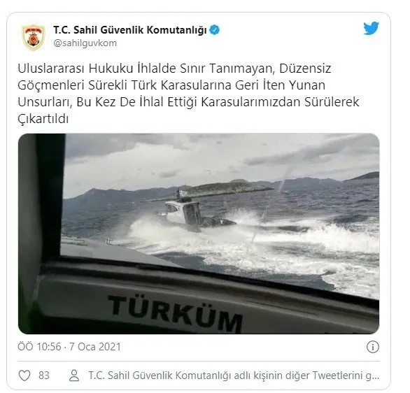 06 Ocak 2021 tarihinde saat 10.03'te Kardak Kayalıkları bölgesinde 2 Yunan Sahil Güvenlik unsuru tarafından karasuyu ihlali yapılmıştır. 4 Türk Sahil Güvenlik Botu tarafından gerçekleştirilen önleme manevraları ile karasuyu ihlali yapan 2 Yunan unsuru karasularımızdan çıkartılmıştır.