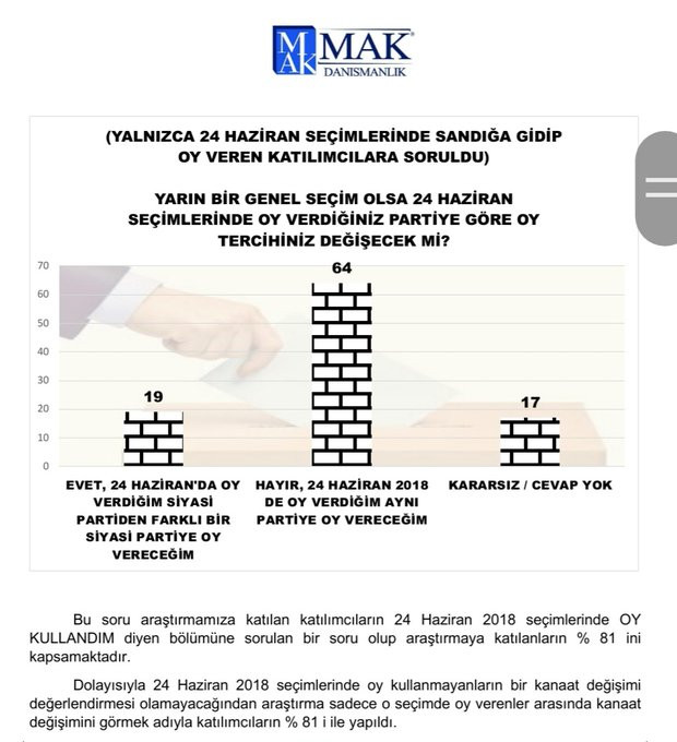 Erzurum Güncel- MAK Danışmanlık tarafından yapılan Eylül ayında yapılan seçim anketinde, 24 Haziran 2018 seçimlerine katılanlara yeni bir seçimde aynı partiye oy verip vermeyecekleri soruldu. Yanıtların araştırmaya katılanların yüzde 81’ini kapsadığı belirtilirken, soru yalnızca 24 Haziran seçimlerinde sandığa gidip oy veren katılımcılara soruldu.