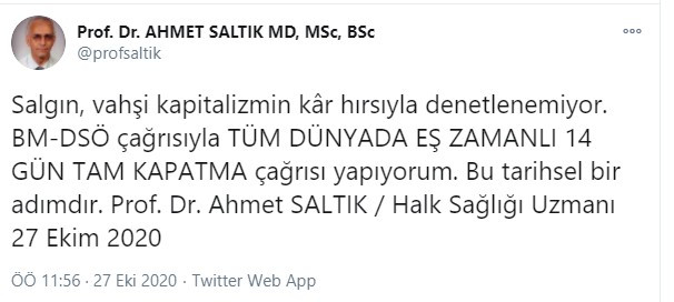 "Salgın, vahşi kapitalizmin kâr hırsıyla denetlenemiyor. BM-DSÖ çağrısıyla tüm dünyada eş zamanlı 14 gün tam kapatma çağrısı yapıyorum."