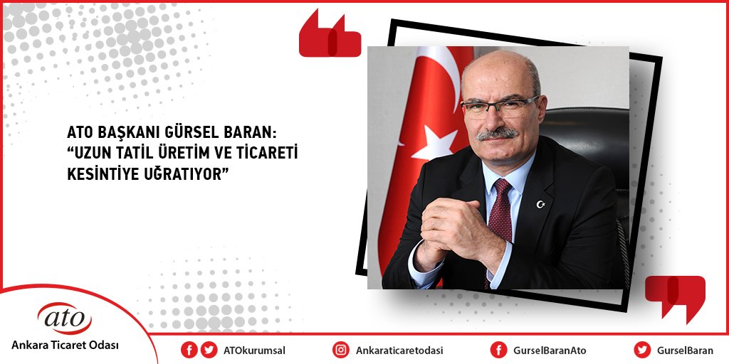 Ankara Ticaret Odası (ATO) Yönetim Kurulu Başkanı Gürsel Baran, uzun tatillerin turizm ve seyahat sektörü dışında kalan sektörlerde üretim ve ticari hayatı kesintiye uğrattığını belirterek,