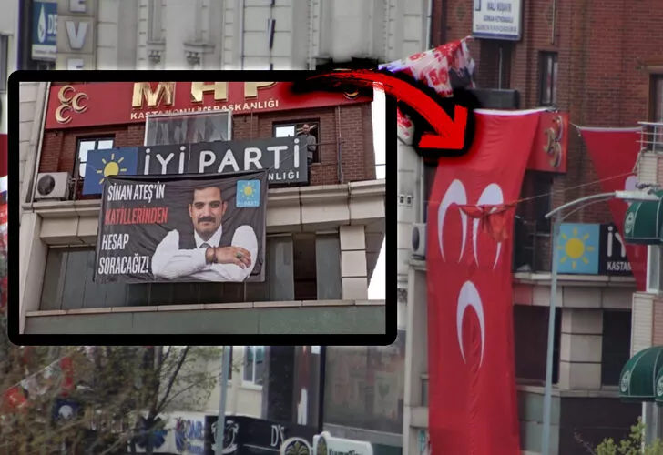 Erzurum Güncel- Önce İYİ Partililer pankart astı, ardından MHP'lilerin astığı bayrakla İYİ Parti'nin pankartı kapatıldı. MHP lideri Bahçeli'nin Kastamonu'da gerçekleştirdiği miting öncesi meydana gelen 'pankart düellosu'ndan kareler sosyal medyada da gündem yarattı. Sinan Ateş yazılı pankartın kapatılmasıyla ilgili İYİ Parti'den gelen açıklama dikkat çekti.