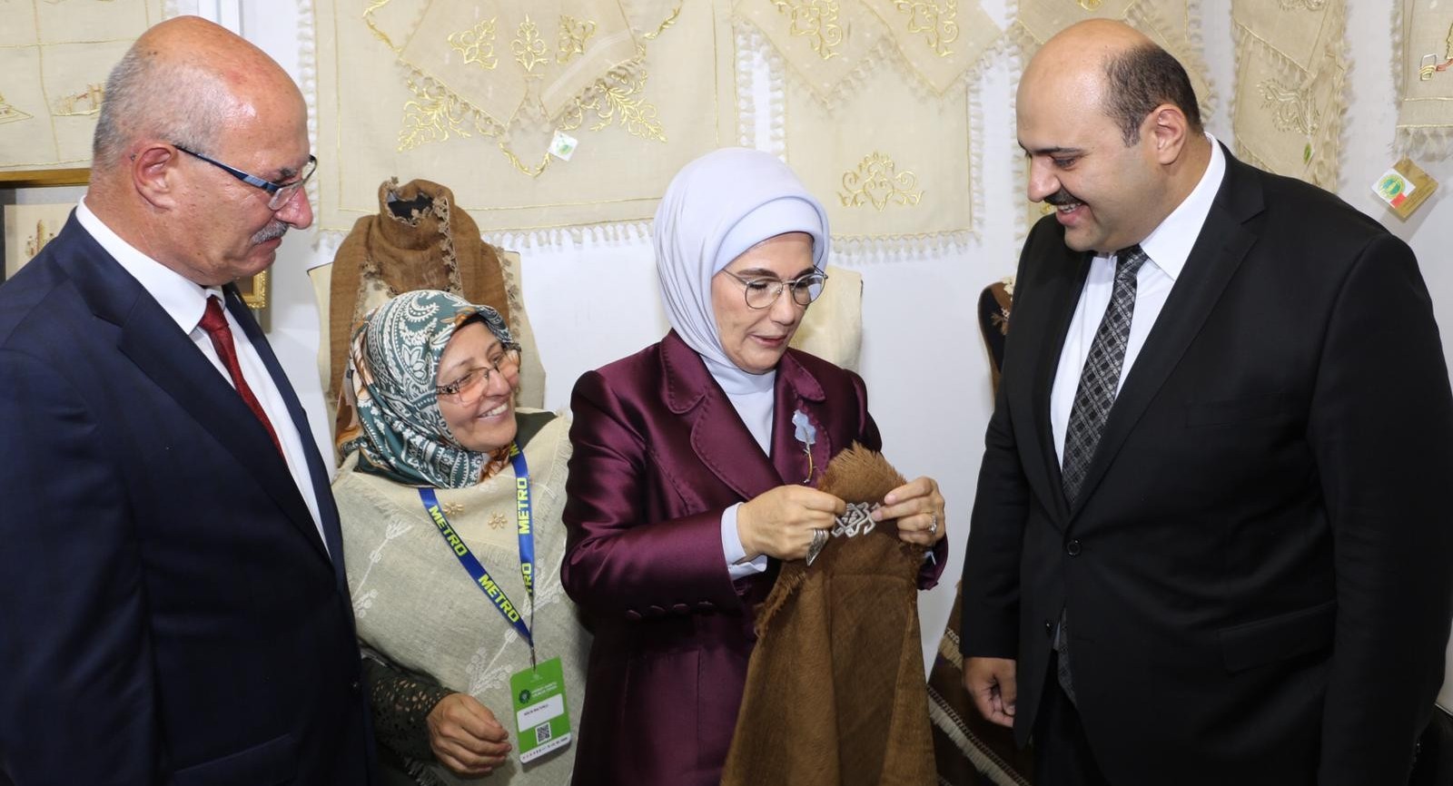 Cumhurbaşkanı Recep Tayyip Erdoğan’ın eşi Emine Erdoğan, Aziziye Belediyesi’nin standını ziyaret ederek Başkan Muhammed Cevdet Orhan ve Aktif İş Kadınları Derneği Başkanı Hülya Saltuklu’dan sergilenen ürünler ile alakalı bilgi aldı. Ehramdan yapılan modern tasarımları çok beğendiğini ifade eden Emine Erdoğan, Başkan Orhan’a ürün yelpazesinin daha da artırılması gerektiğini ifade etti.