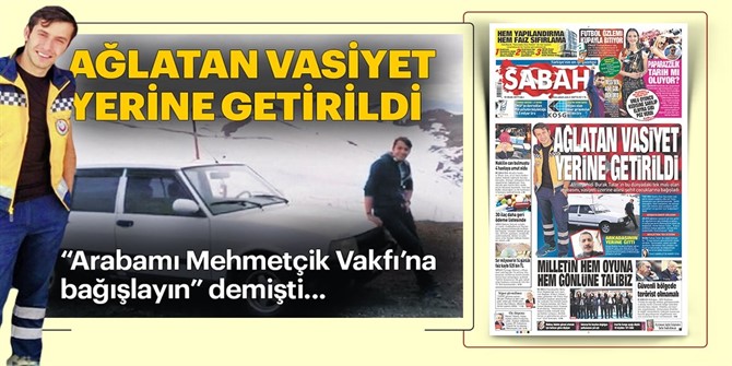 TSK'nın 'Zeytin Dalı Harekatı' sırasında teröristlerin Afrin'de el yapımı patlayıcıyı infilak ettirmesi sonucu şehit olan Ulusal Medikal Kurtarma Ekibi (UMKE) görevlisi Burak Tatar'ın cephe hattında annesi Hülya Tatar'ı arayarak 'ana şehit olursam arabamı şehit çocukları ve gazilerin ihtiyaçları için bağışlayın' dediği o vasiyeti gerçekleştirildi. Türkiye'yi ağlatan o vasiyet kapsamında, şehidin acılı anne ve babası oğullarının hayattayken gözü gibi bakıp, koruduğu, birikmişi ile aldığı arabasını satarak, gelirini Mehmetçik Vakfı'na bağışladı.