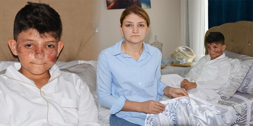 Erzurum Güncel- Erzurum’da şehir turu atarken aracın açılan üst bölümünden bakan sünnet çocuğu Muhammet Samet Kuytan (11), konvoyun önünü kesmek isteyen çocukların çektiği ipin yüzüne gelmesi sonucu yaralandı. İpin boynuna takılmasından son anda kurtulup ölümden dönen Kuytan, “İp az daha boynumu koparacaktı. En güzel günüm hastanede geçti” dedi.