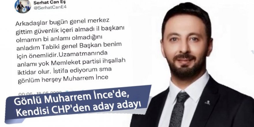 Memleket Partisi yöneticisi Serhat Can Eş, sosyal medya hesabından yaptığı açıklamada, “Arkadaşlar bugün genel merkeze gittim, güvenlik içeri almadı. İl başkanı olmamın bir anlamı olmadığını anladım. Tabi ki Genel Başkan benim için önemlidir. Uzatmanın da anlamı yok. Memleket Partisi inşallah iktidar olur. İstifa ediyorum ama gönlüm her şey Muharrem İnce” ifadelerini kullandı.