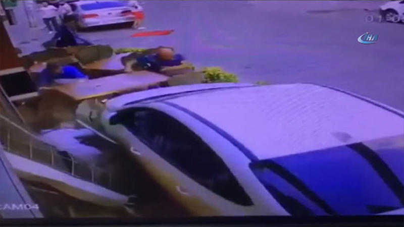 Üç kişinin kıl payı ölümden döndüğü kaza saniye saniye güvenlik kameralarına yansıdı. Görüntülerde masaya oturan üç kişiye restoranda otururken saniyeler içerisinde araç çarpıyor. 2 kişi, çarpmanın etkisiyle metrelerce masalarla birlikte savruluyor; diğer kişi ise aracın altında kalmaktan son anda kurtulduğu da görüntülere yansıyor. Restoran kamerası tarafından kaydedilen görüntülerde, yine masada oturan bir kişide can havliyle kaçarken yere düşüyor. Bu sırada ise çok sayıda vatandaşında kazazedelere yardım için koştukları anlarda anbean kameralara yansıyor.