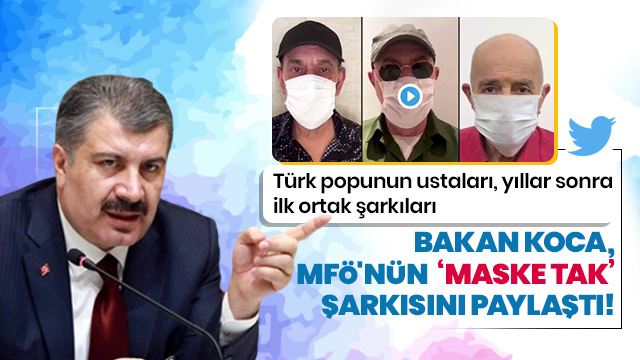 Sağlık Bakanı Koca, MFÖ'nün COVID-19 tedbirlerine ilişkin şarkısını paylaşarak, Bizim söylemek istediklerimizi, sağ olsunlar, çok güzel söylüyorlar. Söz; maskeli, mesafeli, sürprizli müziğin..." dedi.