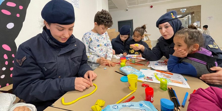 Çocuklarla oyun hamuru, resim ve boyama etkinliklerinde bir araya gelen Jandarma personeli, onlara bir nebze olsun depremin acılarını unutturmak için çaba sarf ediyor.