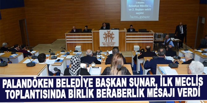 Gerçekleşen ilk toplantı, alınan yoklama ile başlayıp, Saygı duruşu ve İstiklal Marşı’nın okunmasıyla devam etti. Ardından Meclis’e Başkanlık yapan Palandöken Belediye Başkanı Muhammet Sunar açılış konuşması gerçekleştirdi. Sunar yaptığı konuşmada: “Bu meclis malum olduğu üzere bir yerel seçimi geride bıraktı. Seçilen arkadaşlarımı bir kez daha tebrik ediyorum. Artık hizmet vaktidir. Bu meclis Palandöken İlçesinde yaşayan vatandaşlara hizmet için görev yapacaktır. Belediye meclisimizle, çalışanlarımızla örnek bir belediyecilik, örnek bir kardeşlik, örnek bir dayanışma sergileyeceğimize kanaatim tamdır. Bu hususta meclis üyelerimizin tamamının görüşünün de aynı doğrultuda olduğunu biliyorum. Bütün arkadaşlarımın çalışmalarımıza her zaman olumlu katkı sunacaklarını şimdiden umut ediyorum. Bizim niyetimiz Palandöken halkına hizmet etmek. Burada kurumlar arası işbirliğini her zaman ön sıraya koyacağız. Çatışmadan çalışacağız. Daha güzel bir ilçe için görev yapacağız” diye konuştu.