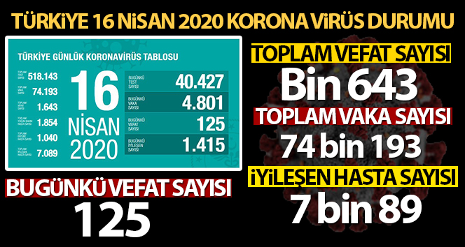 Erzurum Güncel- Sağlık Bakanlığı, korona virüse ilişkin 16 Nisan 2020 tarihli son verileri açıkladı. Son 24 saatte korona virüs nedeniyle 125 kişinin hayatını kaybettiğini, toplam can kaybının ise bin 854‘e yükseldiğini bildirdi. Açıklamaya göre, bugün 40 bin 427 test yapılırken, 4 bin 801 yeni vaka tespit edildi. Toplam vaka sayısı 74 bin 193 olurken, bugün iyileşen bin 415 kişi ile birlikte toplam 7 bin 89 kişi iyileşti. Toplam entübe hastası bin 40 kişi, toplam yoğun bakım hastası bin 854 kişi oldu.