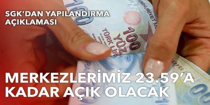 Duyuruda, "Başvuru süresi Sayın Cumhurbaşkanımızın Kararı ile 30 Eylül 2021 tarihine uzatılan 7326 sayılı Bazı Alacakların Yeniden Yapılandırılması ile Bazı Kanunlarda Değişiklik Yapılmasına İlişkin Kanun uyarınca, kapsama giren borçlarını yapılandırmak isteyen vatandaşlarımızın başvurularını almak üzere, Sosyal Güvenlik İl Müdürlüklerimiz ve Sosyal Güvenlik Merkezlerimiz 30.09.2021 tarihinde saat 23.59'a kadar açık olup vatandaşlarımıza hizmet verecektir." ifadeleri kullanıldı.