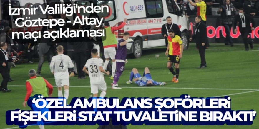 Spor Toto 1. Lig'de ezeli rakipler Göztepe ve Altay'ın maçının çıkan olaylar nedeniyle tatil edilmesinin ardından İzmir Valiliği tarafından konuyla ilgili yazılı açıklama yapıldı. Yapılan açıklamada şu ifadelere yer verildi: “İlimiz Gürsel Aksel Stadyumu'nda 27.11.2022 günü oynanan Göztepe – Altay Spor Toto 1. Lig müsabakası ile ilgili olarak aşağıdaki açıklamanın yapılmasına gerek görülmüştür. Bahse konu maçın 19. dakikasında misafir tribününün bulunduğu kısımdan, işaret fişeği diye tabir edilen yanıcı madde Göztepe taraftarlarına fırlatılmıştır. Fişek Göztepe taraftarı Mehmet Çakır'a isabet etmiş ve yaralanmasına neden olmuş, Çakır hastaneye intikal ettirilerek tedavi altına alınmıştır.”