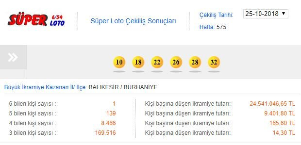 Erzurum Güncel- Süper Loto çekiliş sonuçları açıklandı. Haftalardır devreden büyük ikramiye 24 milyon 541 liraya ulaştı. Balıkesir'den bir kişi adeta turnayı gözünden vurdu ve çılgın ikramiyenin sahibi oldu.