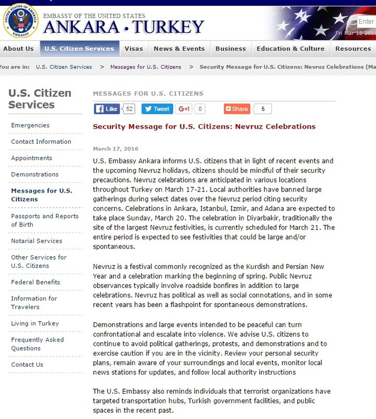 ABD Büyükelçiliği mesajında 21 Mart Pazartesi için ise Diyarbakır'da kutlanacak Nevruz'un çok daha büyük bir katılımla olabileceğine yer verdi. Vatandaşlarını ulaşım noktaları, hükümet binaları ve kalabalık meydanlarda gerçekleşebilecek terör saldırılarına karşı dikkatli olması konusunda uyardı.
