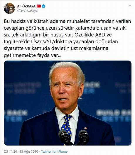 Ancak gelin görün ki AK Partili Özkaya ABD Başkan adayı Joe Biden'e tepki göstermek isterken gözler AK Parti'nin içerisindeki ABD ve İngilitere'de eğitim almış olan isimlere çevrildi.