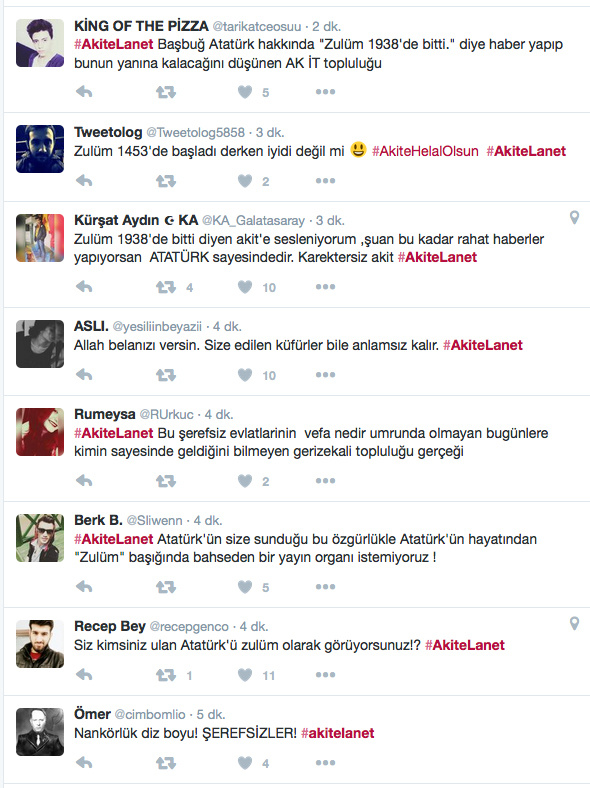 Ulu önder Atatürk ölümünün 77. yılında tüm yurtta özlemle ve saygıyla anılırken Akit'in televizyon kanalı Akit TV, 10 Kasım haberinde "Zulüm 1938'de son buldu" ifadelerini kullandı. Twitter'da isyan eden bir çok kullanıcı #AkiteLanetkampanyası başlattı.