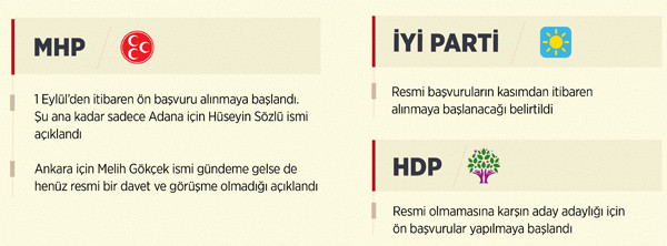 İYİ PARTİ KASIM AYINDA BAŞVURU ALMAYA BAŞLAYACAK: İYİ Parti'de aday adaylığı başvuruları henüz alınmıyor. Bazı yerlerde adaylık açıklaması yapan ve çalışan aday adayları mevcut ancak parti, henüz hiç başvuru almadı. Başvuruların kasımdan itibaren alınması planlanıyor.