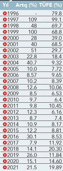 Asgari ücret son 19 yılda birkaç dönem hariç genellikle enflasyonun üzerinde belirlenmiş durumda. Geçen yıl brüt asgari ücret yüzde 21.56 arttı. 2002'de ortalama 184 TL olan net asgari ücret 2021'de 2.825 TL oldu. Bu da nominal olarak yüzde 1.435'lik artış anlamına geliyor. Ancak enflasyon hesaba katıldığında reel artış bu orandan daha düşük... Hükümet son 19 yıldır genellikle asgari ücreti enflasyonun üzerinde belirledi. 2022 asgari ücreti belirlenirken de enflasyonun en az 7-8 puan üzerinde bir artış olabileceği belirtiliyor.
