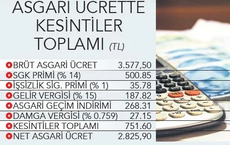 Şu anda asgari ücretten SGK primi, gelir vergisi, damga vergisi ve işsizlik sigortası işçi payı olmak üzere 752 TL kesinti yapılıyor. Asgari ücretliden yüzde 15 gelir vergisi ve binde 7.59 oranında damga vergisi kesiliyor. Bu iki vergi için işçinin maaşından yapılan aylık kesinti 214 TL. 8 milyon asgari ücretli var.