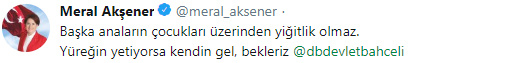 Erzurum Güncel- MHP Genel Başkanı Devlet Bahçeli, İYİ Parti Genel Başkanı Meral Akşener'i sosyal medyadan uyardı. MHP'yi bölüp parçalamakla suçladığı Akşener'i "Sonuçlarına katlanırsın, büyük lafı dinle" sözleriyle uyaran Bahçeli'ye İYİ Parti'den de aynı sertlikle cevap geldi. İşte dün gece sosyal medyada karşılıklı yaşanan o söz düellosu;