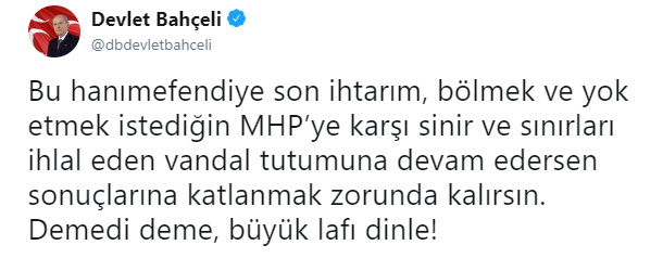 "Bu hanımefendiye son ihtarım, bölmek ve yok etmek istediğin MHP’ye karşı sinir ve sınırları ihlal eden vandal tutumuna devam edersen sonuçlarına katlanmak zorunda kalırsın. Demedi deme, büyük lafı dinle!"