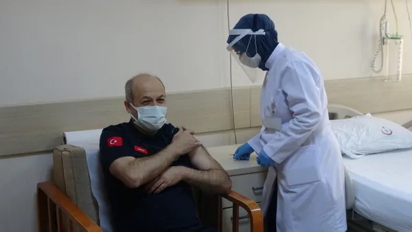 Cumhurbaşkanı Yardımcısı Fuat Oktay, Ankara Şehir Hastanesinde CoronaVac aşısının ilk dozunu yaptırdı. Tedbir amacıyla 15 dakika beklemesinin ardından basın mensuplarına açıklamalarda bulunan Oktay, "İnşallah nisana doğru kendi aşılarımız da çıkacak. Ondan sonra önümüz tamamen açılacaktır. Tüm vatandaşlarımıza çok rahatlıkla gelip aşılarını yaptırmalarını tavsiye ediyorum." dedi.