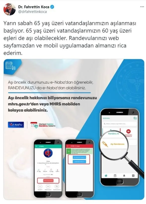 Bakan Koca, Twitter hesabından yaptığı paylaşımda, "Yarın sabah 65 yaş üzeri vatandaşlarımızın aşılanması başlıyor. 65 yaş üzeri vatandaşlarımızın 60 yaş üzeri eşleri de aşı olabilecekler." ifadelerini kullandı.