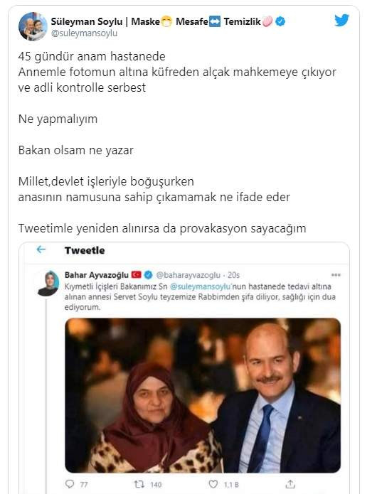 Soylu, konuyla ilgili Twitter hesabından yaptığı açıklamada "45 gündür anam hastanede. Annemle fotoğrafımın altına küfreden alçak mahkemeye çıkıyor ve adli kontrolle serbest. Ne yapmalıyım? Bakan olsam ne yazar? Millet, devlet işleriyle boğuşurken anasının namusuna sahip çıkamamak ne ifade eder? Tweetimle yeniden alınırsa da provokasyon sayacağım" dedi.