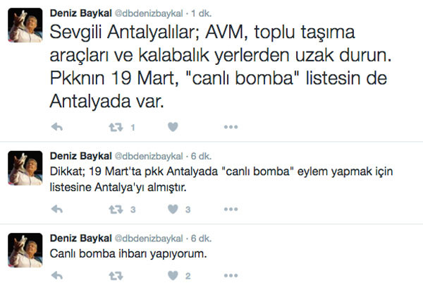 Deniz Baykal, “Canlı bomba ihbarı yapıyorum. Dikkat; 19 Mart’ta PKK, Antalya’da “canlı bomba” eylemi yapmak için listesine Antalya’yı almıştır. Sevgili Antalyalılar; AVM, toplu taşıma araçları ve kalabalık yerlerden uzak durun. PKK'nın 19 Mart, "canlı bomba" listesinde Antalya da var” dedi.