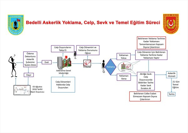 Bedelli askerlik hizmetinden yararlanacak yükümlülerin temel askerlik eğitimlerinin en kısa sürede ve sorunsuz tamamlanması amacıyla hazırlanan celp takvimi, muhtemel durumlara ilişkin açıklamalar ile "yoklama, celp, sevk ve temel eğitim süreci diyagramı" Milli Savunma Bakanlığı'nın internet sitesinde yayımlandı.İlk 3 döneme ait temel eğitime planlanan yükümlülerin birlik bilgileri, yoklama durumları ve sevk evraklarını alabilecekleri tarihler de belirlendi.