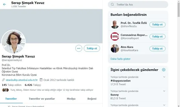 Prof. Dr. Serap Şimşek Yavuz'un gerçek hesabı @serapsimsekyvz. @ProfSerapSimsek hesabı ise sahte. Sahte hesaptaki takipçi sayısı 16 bin. Yavuz'un gerçek hesabındaki takipçi sayısı 6 bin 278. Sahte hesaptaki son mesaj, virüsün sıcakta duracağına ilişkin somut veri olmadığı, yavaşlama ihtimalinin olduğu yönünde. Bilim Kurulu'nun eldiven kullanımını doğru bulmadığını biliyoruz. Ancak sahte hesapta sık sık eldiven kullanımı öneriliyor.