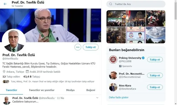 Twitter'da Prof. Dr. Tevfik Özlü adına açılan iki hesap bulunuyor. Her ikisinin de adresi @drtevfikozlu. Tevfik Özlü'nün gerçek hesabında takipçi sayısı 35 bin 200. Sahte hesabı ise 42 bin 900 kişi tarafından takip ediyor. Her iki hesapta kullanılan fotoğraflar aynı. Tevfik Özlü'nün gerçek hesabı ağustos 2019'da, sahte olan ise Aralık 2019'da açılmış. "Sokağa çıkma yasağı ilan edilsin" kampanyalarının yürütüldüğü 21 Mart haftasında Tevfik Özlü adına açılan sahte hesaptan atılan mesajlar dikkat çekici…