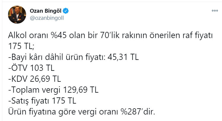 “Alkol oranı %45 olan bir 70’lik rakının önerilen raf fiyatı 175 TL;