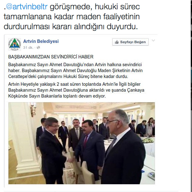 "Başbakanımız Sayın Ahmet Davutoğlu’ndan Artvin halkına sevindirici haber. Başbakanımız Sayın Ahmet Davutoğlu Maden Şirketinin Artvin Cerattepe'deki çalışmalarını Hukuki Süreç bitene kadar durdu.