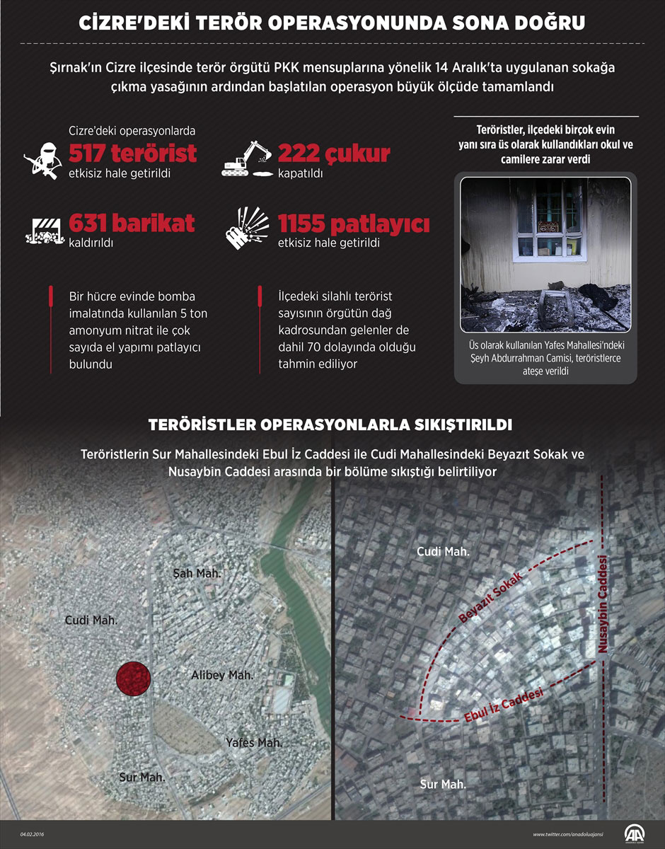 Buna göre, Cizre'deki operasyonda 1 terörist etkisiz hale getirilirken, 2 terörist yakalandı. İlçede etkisiz hale getirilen toplam terörist sayısı 575 oldu.