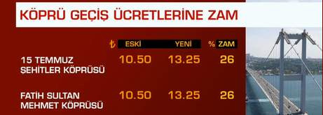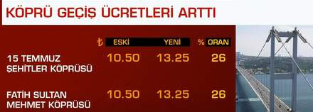15 Temmuz Şehitler ve Fatih Sultan Mehmet köprüleri geçiş ücreti yüzde 26 artışla 10.50 liradan 13.25 liraya yükseltildi. Motosiklet geçiş ücreti de yüzde 23.5 artışla 5.25 liraya çıktı.