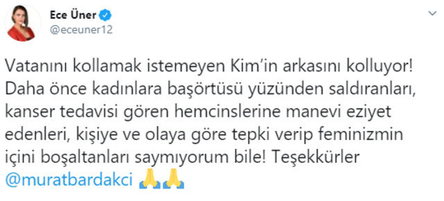 "Vatanını kollamak istemeyen Kim’in arkasını kolluyor! Daha önce kadınlara başörtüsü yüzünden saldıranları, kanser tedavisi gören hemcinslerine manevi eziyet edenleri, kişiye ve olaya göre tepki verip feminizmin içini boşaltanları saymıyorum bile! Teşekkürler @muratbardakci"