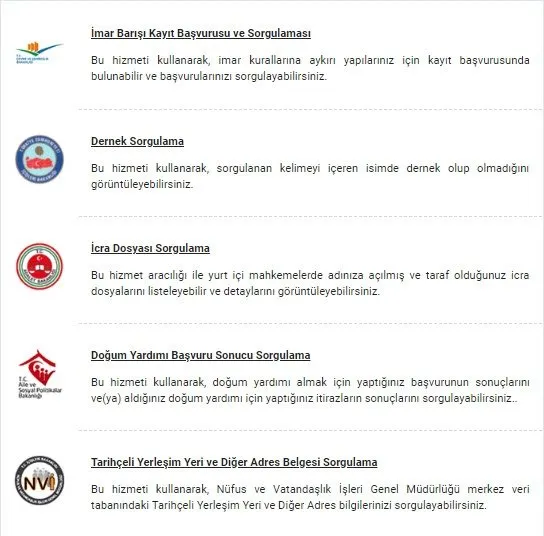 eDevlet üzerinden beş yeni hizmet daha yürürlüğe sunuldu. Artık edevlet ile imar barışı kayıt başvurusu ve sorgulaması, dernek sorgulama, icra dosyası sorgulama, doğum yardımı başvuru sonucu sorgulama ve tarihçeli yerleşim yeri ve diğer adres belgesi sorgulama hizmetlerini de gerçekleştirebilirsiniz.
