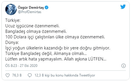 "Türkiye: Ucuz işgücüne özenmemeli. Bangladeş olmaya özenmemeli. 100 Dolara işçi çalıştırılan ülke olmaya özenmemeli. Dünya: İşçi yoğun ülkelerin kazandığı bir yere doğru gitmiyor. Türkiye Bangladeş değil, Almanya olmalı… Lütfen artık hata yapmayalım. Allah aşkına lütfen…"