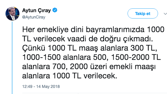 Çıray şunları söyledi: "Her emekliye dini bayramlarımızda 1000 TL verilecek vaadi de doğru çıkmadı. Çünkü 1000 TL maaş alanlara 300 TL, 1000-1500 alanlara 500, 1500-2000 TL alanlara 700, 2000 üzeri emekli maaşı alanlara 1000 TL verilecek."